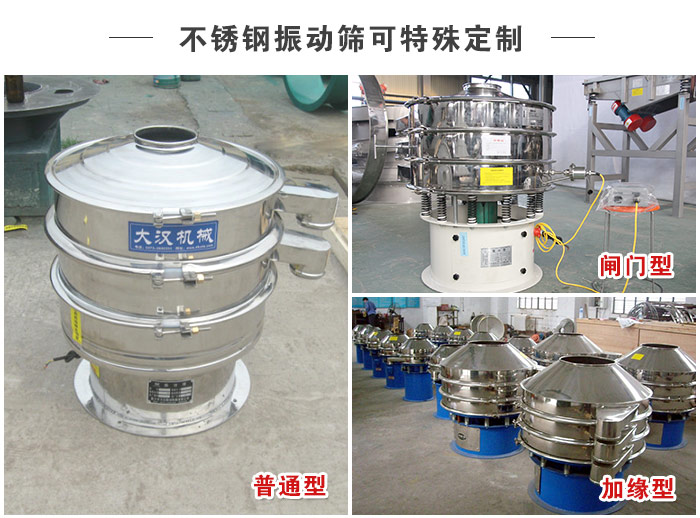 不銹鋼振動篩可按特殊需求特殊定制,是否需要特殊設計定制,如“加緣型、閘門型、密封型,或是框體、底座加高,進料口加料斗等,滿足客戶因場地大小高低配套使用的不同需求。