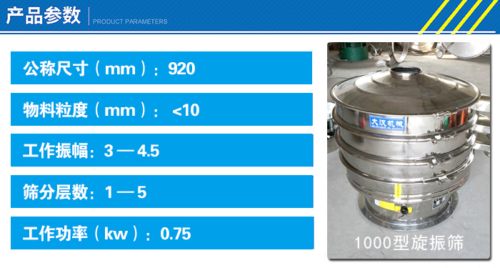 1000型不銹鋼振動(dòng)篩整機(jī)采用不銹鋼304材質(zhì),篩面直徑920mm,網(wǎng)孔規(guī)格在0.028—5mm之間,搭配功率0.75KW的振動(dòng)電機(jī)電機(jī),日篩分花椒粉產(chǎn)量可達(dá)500kg-800kg。具體參數(shù)如下:
