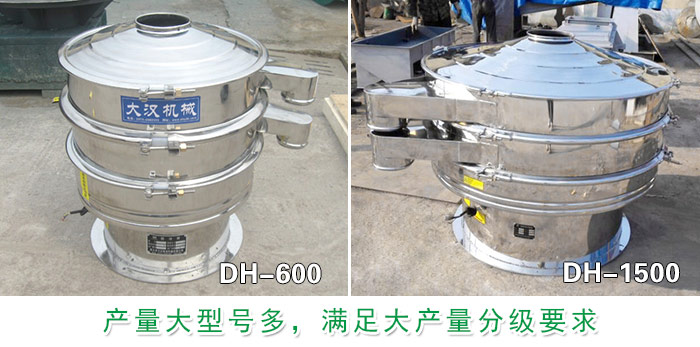 DH系列不銹鋼振動(dòng)篩處理量可達(dá)400kg-1T/h。型號齊全型號分為直徑400mm型、600mm型、800mm型、1000mm型、1200mm型、1500mm型、1800mm型、2000mm型等八種標(biāo)準(zhǔn)機(jī)型。可根據(jù)所需求的產(chǎn)量選擇合適的型號,還可根據(jù)需求特殊定制。