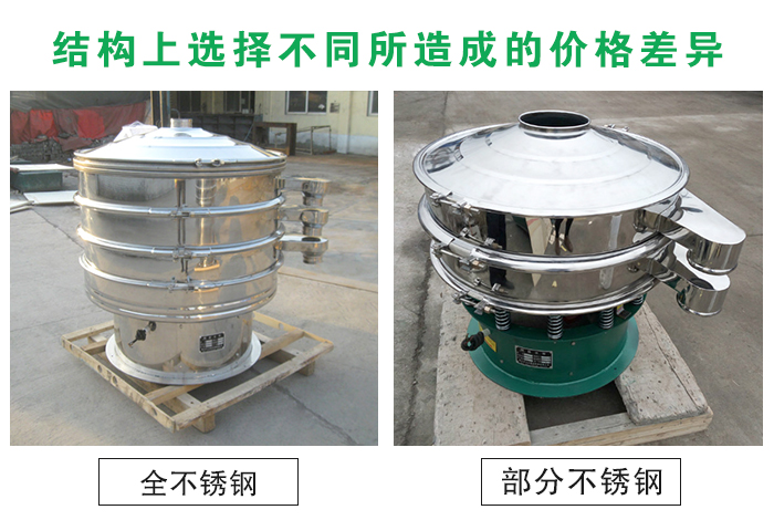 不銹鋼振動(dòng)篩在整體結(jié)構(gòu)上分為整機(jī)均采用不銹鋼制成和與物料接觸部分為不銹鋼材質(zhì)底座為碳鋼材質(zhì)兩種,兩者差價(jià)在2000元以上,全不銹鋼材質(zhì)整體美觀,適合有高需求的客戶使用,與物料接觸部分為不銹鋼材質(zhì)可以在保證物料干凈衛(wèi)生的基礎(chǔ)上為客戶節(jié)省成本。