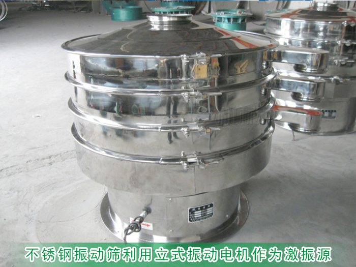 不銹鋼振動(dòng)篩利用立式振動(dòng)電機(jī)作為激振源,電機(jī)上下兩端安裝有扇形的偏心塊,篩分過程中將電機(jī)的旋轉(zhuǎn)運(yùn)動(dòng)轉(zhuǎn)變?yōu)樗?、垂直、傾斜的三次元運(yùn)動(dòng),再把這個(gè)運(yùn)動(dòng)傳遞給上端的篩面進(jìn)行玉米粉篩分,可有效分級(jí)除雜出各種規(guī)格的玉米粉。