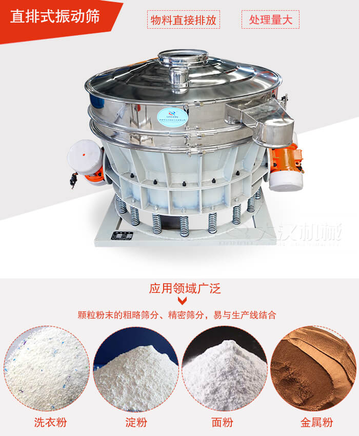 直排式振動(dòng)篩振動(dòng)源分單電機(jī)和雙電機(jī)結(jié)構(gòu)形式,物料運(yùn)行軌跡有多種調(diào)節(jié)形式,設(shè)備適用性顯著增加;物料直接排放有更大的處理量。多用于面粉、淀粉、洗衣粉、金屬粉、添加劑、化工、非礦等行業(yè)的顆粒粉末的粗略篩分、精密篩分,處理量大、易與生產(chǎn)線結(jié)合。可在600MM至1800MM之間選擇。