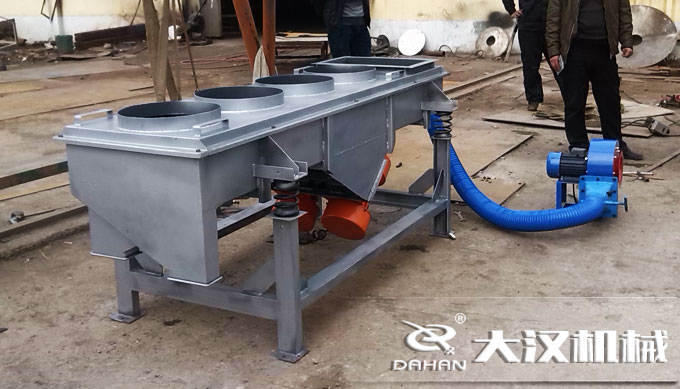 長方形振動篩)是以“大漢牌”DZSF系列直線振動篩為基礎(chǔ),在進料口底部或箱體下側(cè)端增加了風(fēng)機降溫冷卻系統(tǒng),在進料口加裝篩網(wǎng)及小型排料口使大顆粒結(jié)塊物料從小型排料口中排出,該裝置可有效攔截大顆粒并緩沖物料對篩網(wǎng)的沖擊,延長篩網(wǎng)使用壽命(該裝置針對部分物料,不需要可去除)。物料在進入設(shè)備時,位于進料口底部或箱體下側(cè)端的風(fēng)機降溫冷卻系統(tǒng)對其進行降溫作業(yè),兩臺