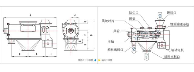 臥式氣流篩:臥式氣流篩是由除塵口,進(jìn)料口,網(wǎng)架,螺旋輸送系統(tǒng),風(fēng)輪,主軸,粗料出料口,驅(qū)動(dòng)電機(jī),細(xì)料出料口