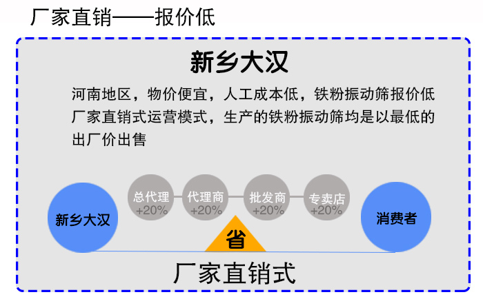 新鄉(xiāng)大漢位于河南新鄉(xiāng),廠家眾多,競爭激烈,廠家之間不得不壓低價格形成價格優(yōu)勢,再加上新鄉(xiāng)地區(qū)物價低,人工成本低,所以鐵粉振動篩報價低,另外,大漢廠家采用廠家直銷式運營模式,生產(chǎn)的所有產(chǎn)品均是以低的出廠價出售,所以關(guān)于鐵粉振動篩價格方面的問題,用戶完全不必擔心,因為大漢廠家給出的報價是為合理的。