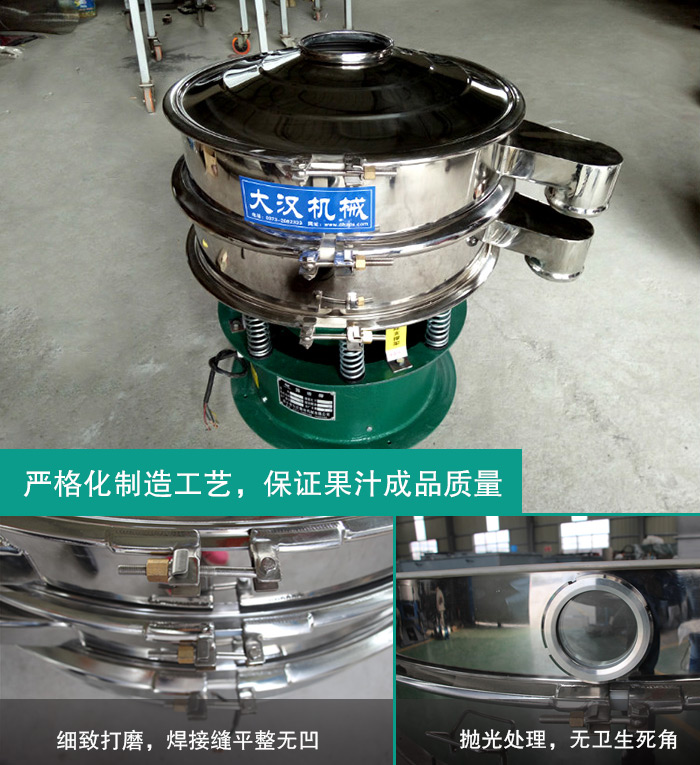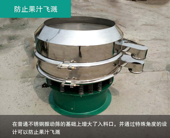 在果汁過濾環(huán)節(jié),常常有用戶反應會出現(xiàn)液體飛濺等現(xiàn)象,效果很不好,為此大漢在不銹鋼振動篩基礎上設計了一款專用于液體過濾的振動篩——加緣式振動篩,它是在普通不銹鋼振動篩的基礎上增大了入料口,并通過特殊角度的設計可以防止液體類物料飛濺,非常適合果汁類的過濾除雜。